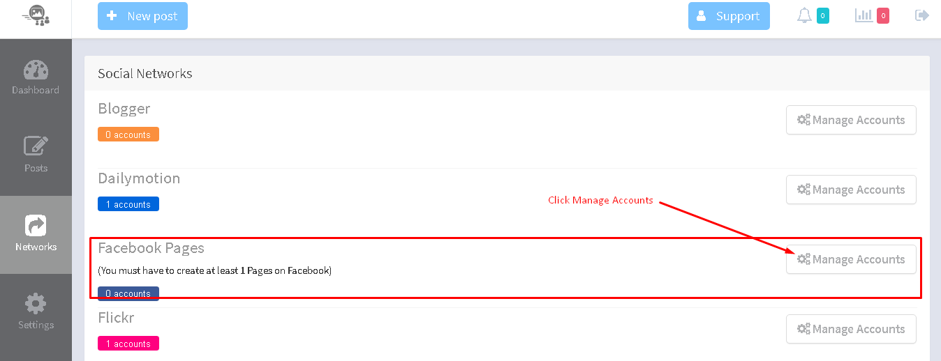 - Go to Networks and click Manage Accounts for Facebook Pages.