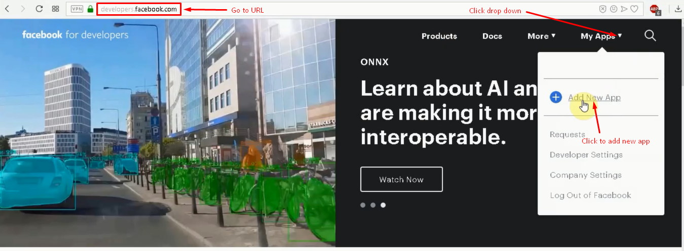 - Log into your Facebook Account. Go to URL https://developers.facebook.com. Click the drop-down beside My Apps and click Add New App.