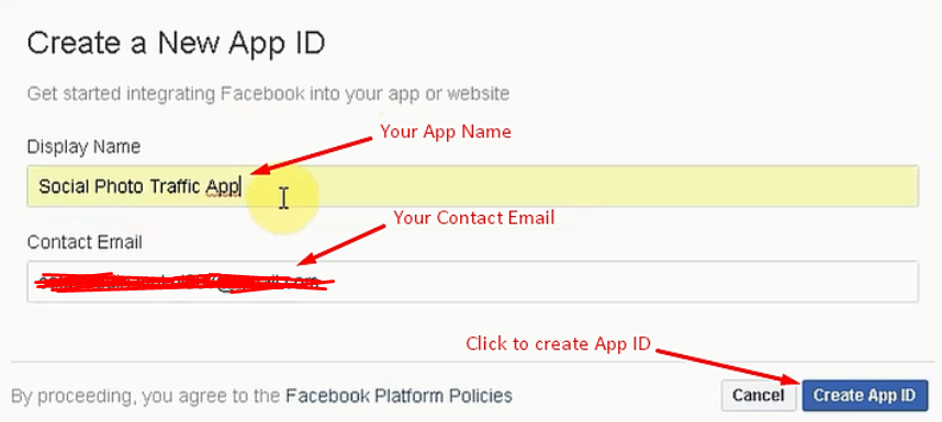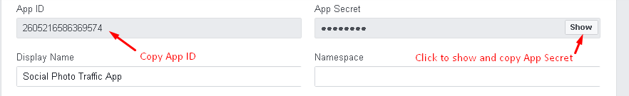 Click Show beside App Secret to display the secret. Copy the App ID and App Secret. Paste them into the respective fields on your SocialPhotoTraffic App.