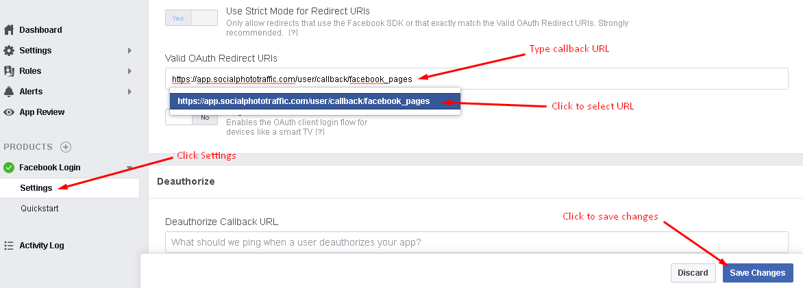 Click Settings Under Facebook Login on the left-hand panel. Scroll down and enter callback URL of SocialPhotoTraffic App https://app.socialphototraffic.com/user/callback/facebook_pages into Valid OAuth Redirect URIs Click Save Changes.