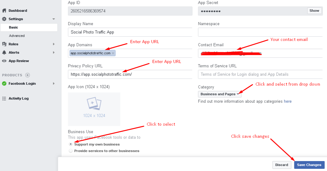 - Click Settings under Dashboard and click Basic. Enter SocialPhotoTraffic App URL https://app.socialphototraffic.com into App Domains and Privacy Policy URL. Select Category from the drop-down list. Select Support my own business and click Save Changes.