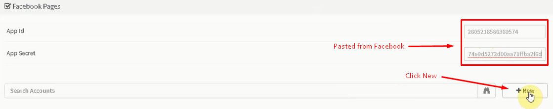 Go back to your SocialPhotoTraffic App and make sure you’ve entered App ID and App Secret correctly from your Facebook Account. Click New to link your Facebook Page.