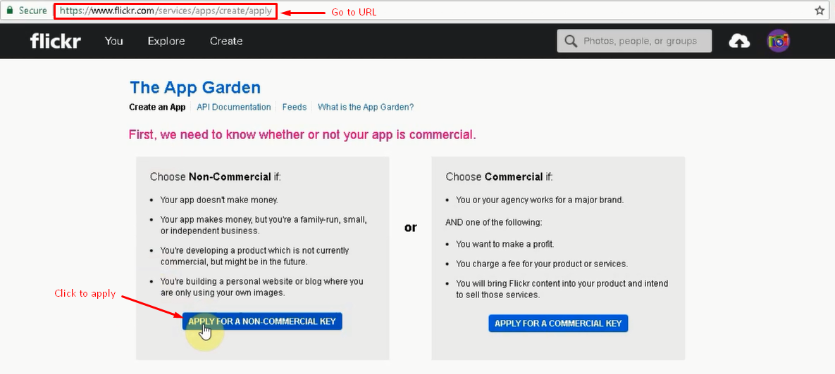 - Go to URL: https://www.flickr.com/services/apps/create/apply and click APPLY FOR A NON-COMMERCIAL KEY.