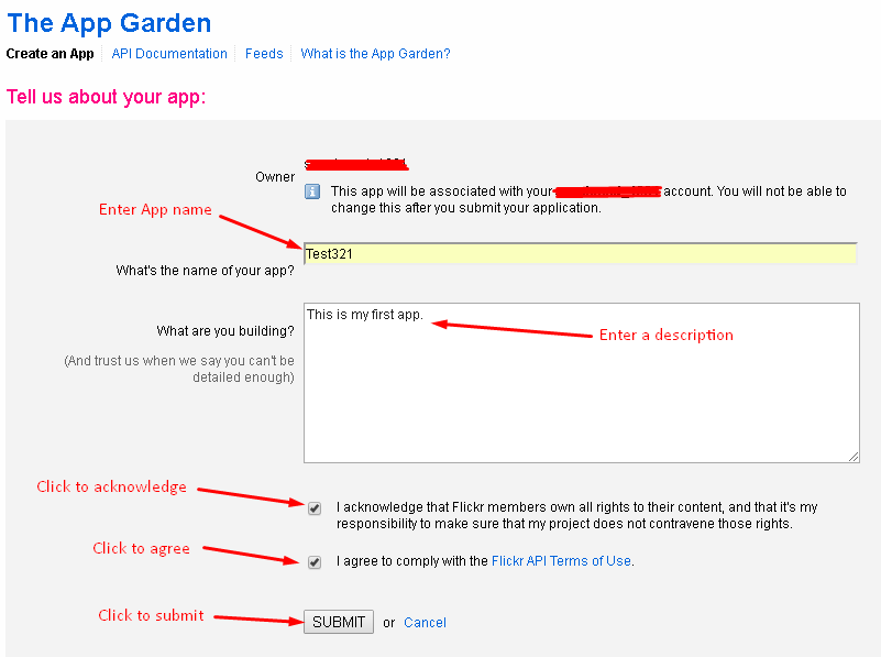 - Enter an App Name, Enter a description, check I acknowledge, check I agree and click SUBMIT.