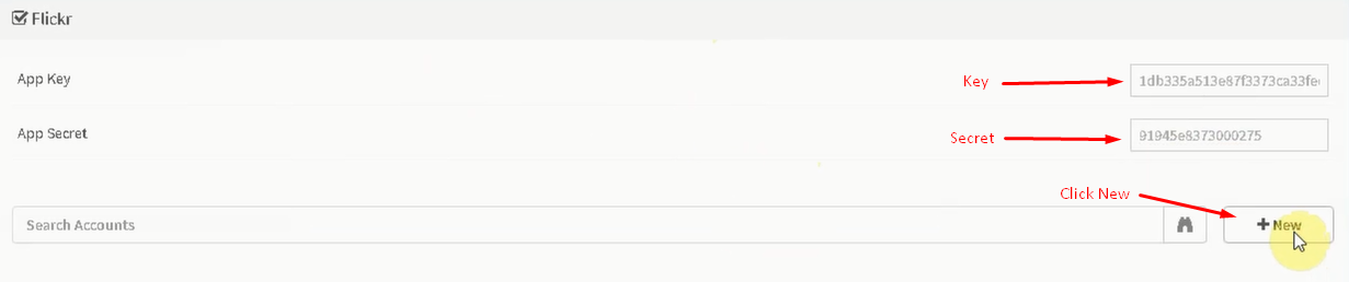- Paste them into the App Key and App Secret fields on your SocialPhotoTraffic App and click New.