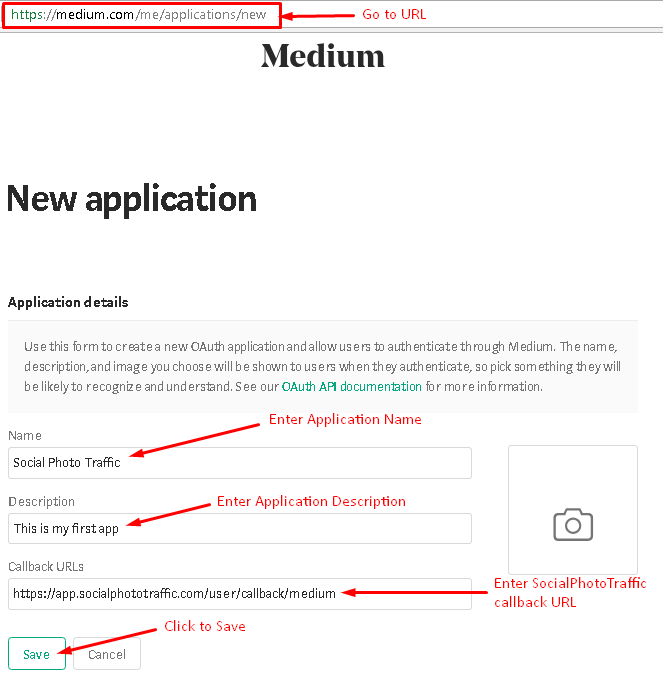 Enter Application Name, enter Application Description, Enter Callback URL of SocialPhotoTraffic App for medium https://app.socialphototraffic.com/user/callback/medium and click Save.